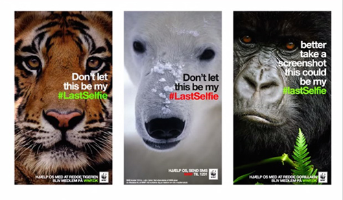 World Wildlife Fund (WWF) ở Đan Mạch và Thổ Nhĩ Kì đã triển khai chiến dịch #LastSelfie để thu hút sự chú ý của mọi người đối với các loài động vật sắp bị tuyệt chủng. Bằng việc sử dụng Snapchat để nâng cao sự nhận biết về sự sụt giảm số lượng của các loài động vật như hổ, gấu trúc, gấu bắc cực, tê giác và khỉ orangutans, WWF đã khôn khéo sử dụng một cách mới để kết nối khán giả – những người đã đổi từ giao tiếp bằng tin nhắn từ ngữ sang thông tin bằng hình ảnh.